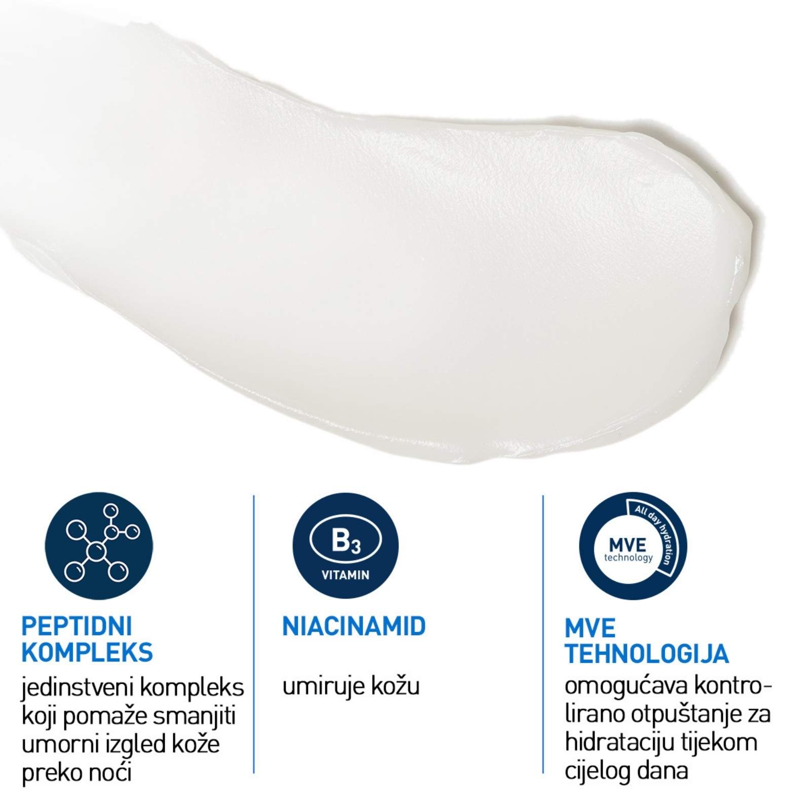 Zahvaljujući patentiranoj MVE tehnologiji, aktivni sastojci postupno se otpuštaju tijekom noći, osiguravajući dugotrajnu hidrataciju i kontinuiranu njegu kože. Formula je dodatno obogaćena niacinamidom (vitamin B3) koji umiruje kožu i poboljšava njezin izgled, čineći je glađom i ujednačenijom.