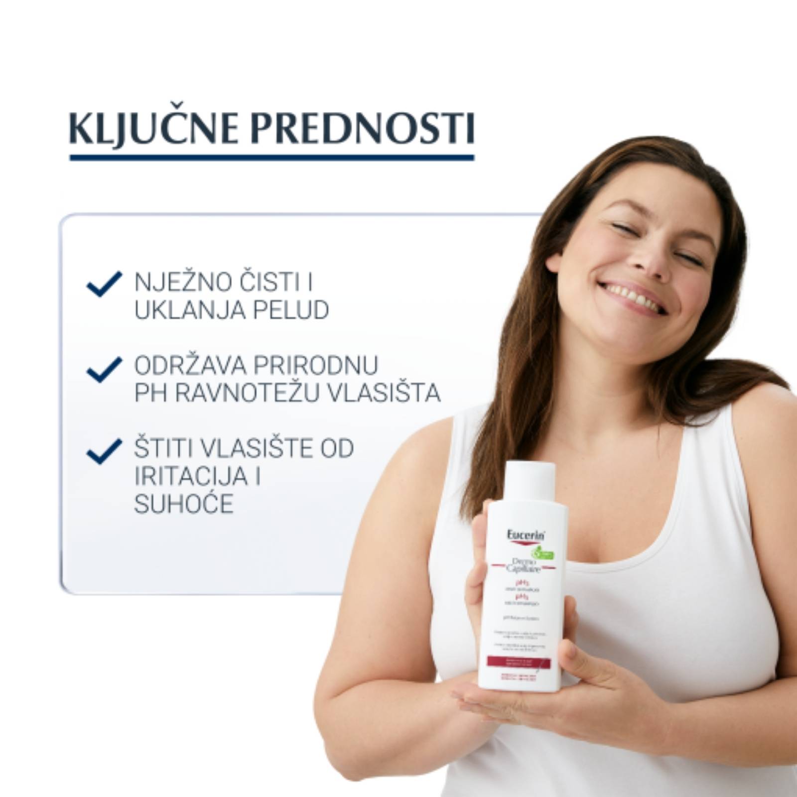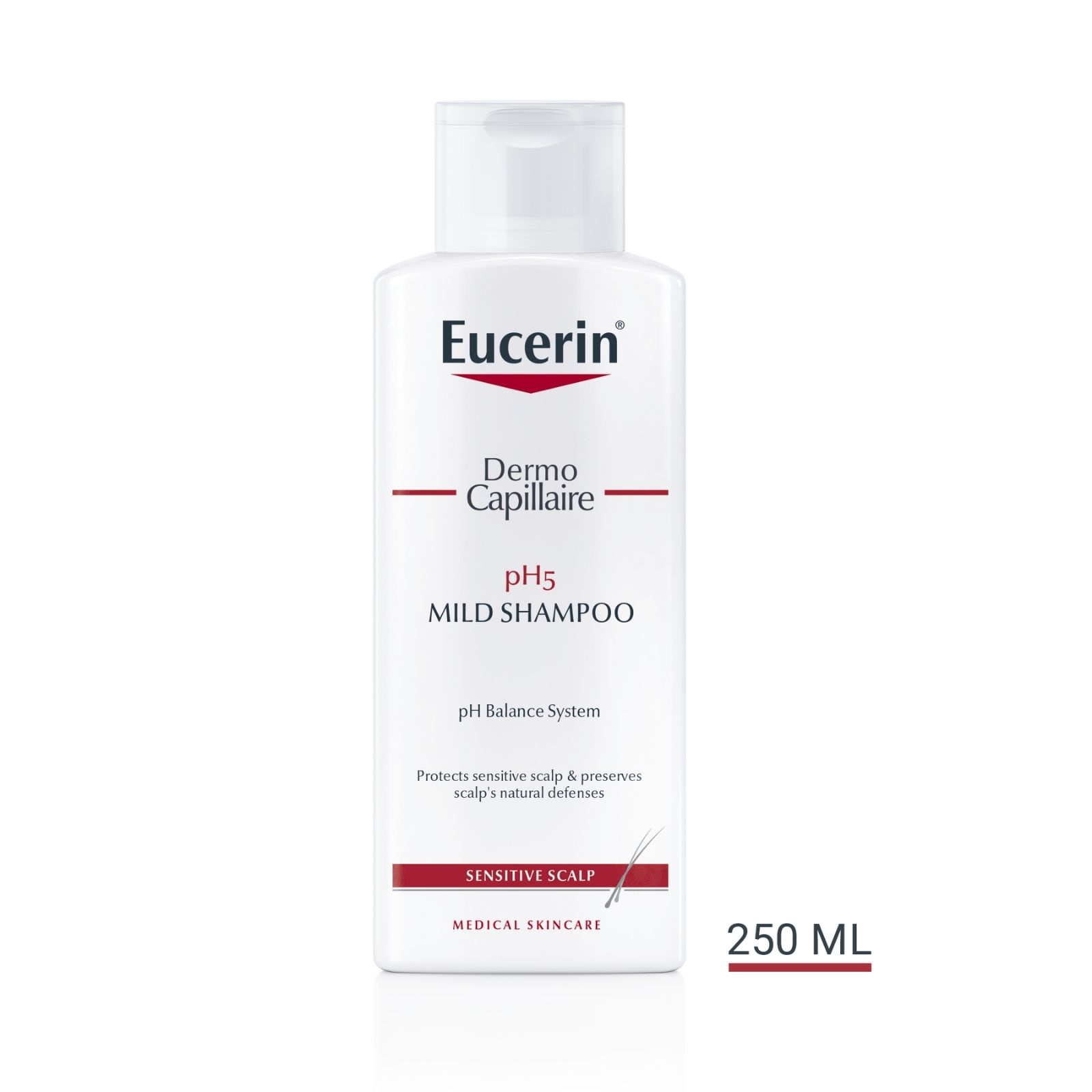 Eucerin DermoCapillaire pH5 šampon posebno je osmišljen kako bi održao prirodnu pH vrijednost kože i učinkovito očistio vlasište i kosu te spriječio suhoću i iritaciju. Uklanja nečistoće, pelud i alergene te daje kosi zdrav sjaj i osjećaj mekoće i podatnosti.