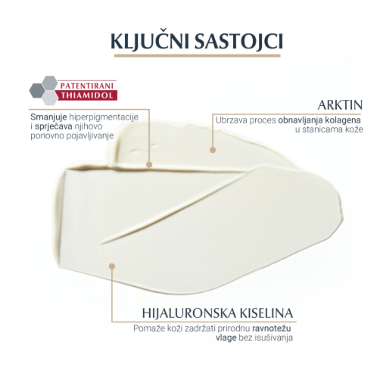 Brzo upijajuća korigirajuća krema za hiperpigmentacije na rukama sadrži patentirani thiamidol koji smanjuje pojavu hiperpigmentacije i sprječava njihovo ponovno pojavljivanje.