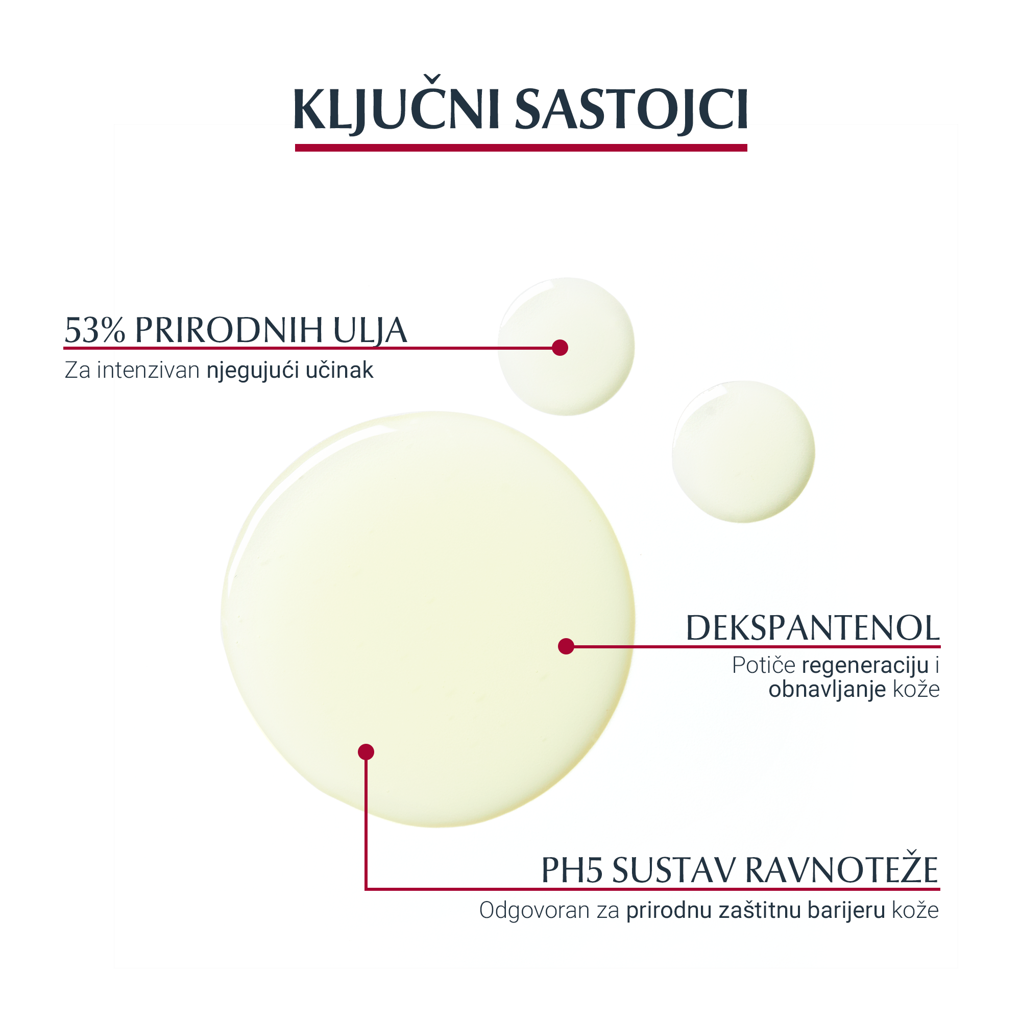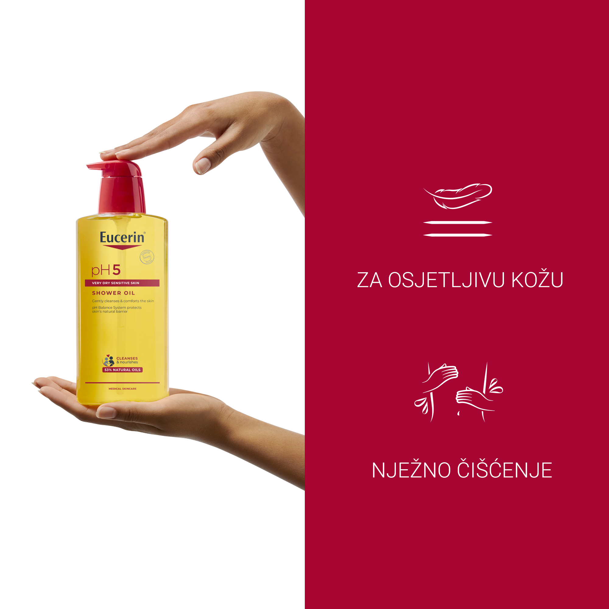 Jedinstveno ulje za tuširanje Eucerin pH Balance System koji sadrži citratni pufer i derivat citrične kiseline obnavlja i stabilizira optimalnu pH vrijednost kože dok dekspantenol pruža regenerativna svojstva.