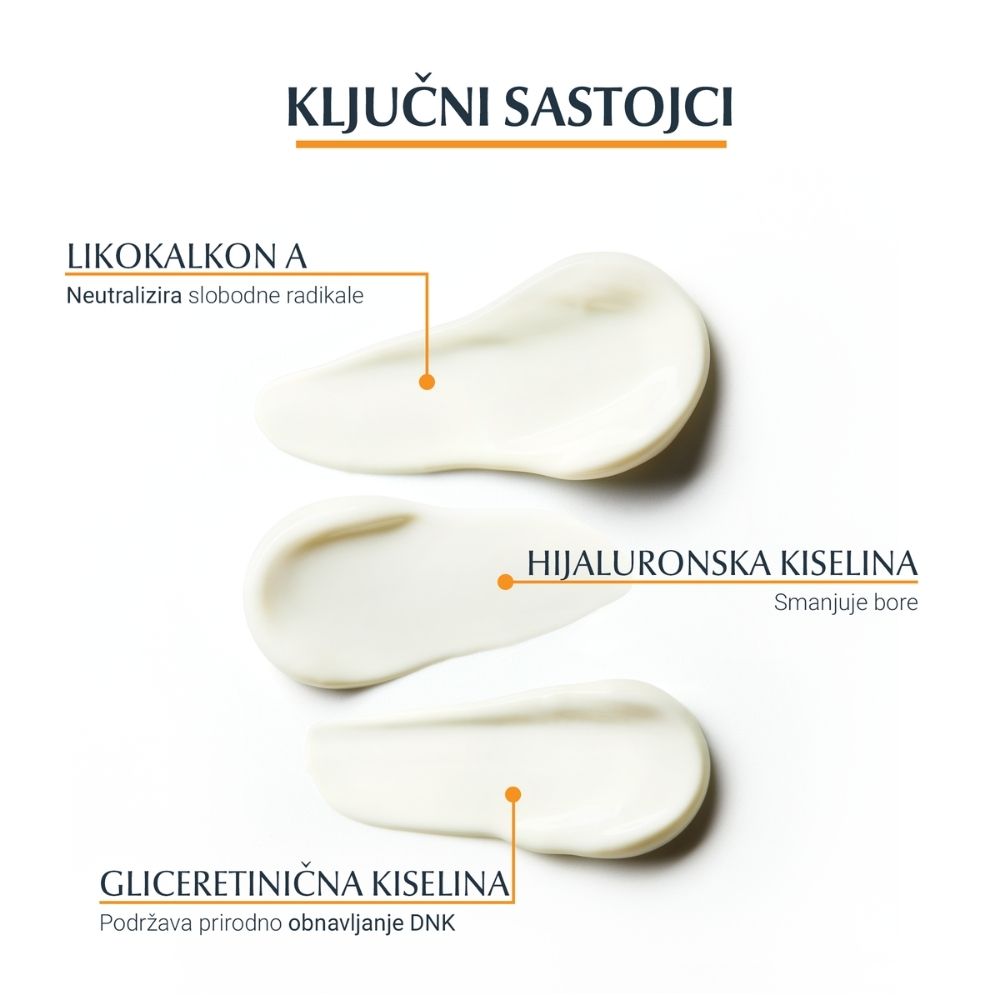 Napredna spektralna tehnologija kombinira širokopojasne i fotostabilne UVA/UVB filtere za visoku UV zaštitu s licochalconom A za neutralizaciju slobodnih radikala uzrokovanih UV i HEVIS svjetlošću. Anti-age krema za sunčanje također uključuje gliceretiničnu kiselinu koja podržava vlastiti mehanizam obnavljanja DNA kože te kratkolančanu i dugolančanu hijaluronsku kiselinu koja vidljivo smanjuje bore na licu i dekolteu.