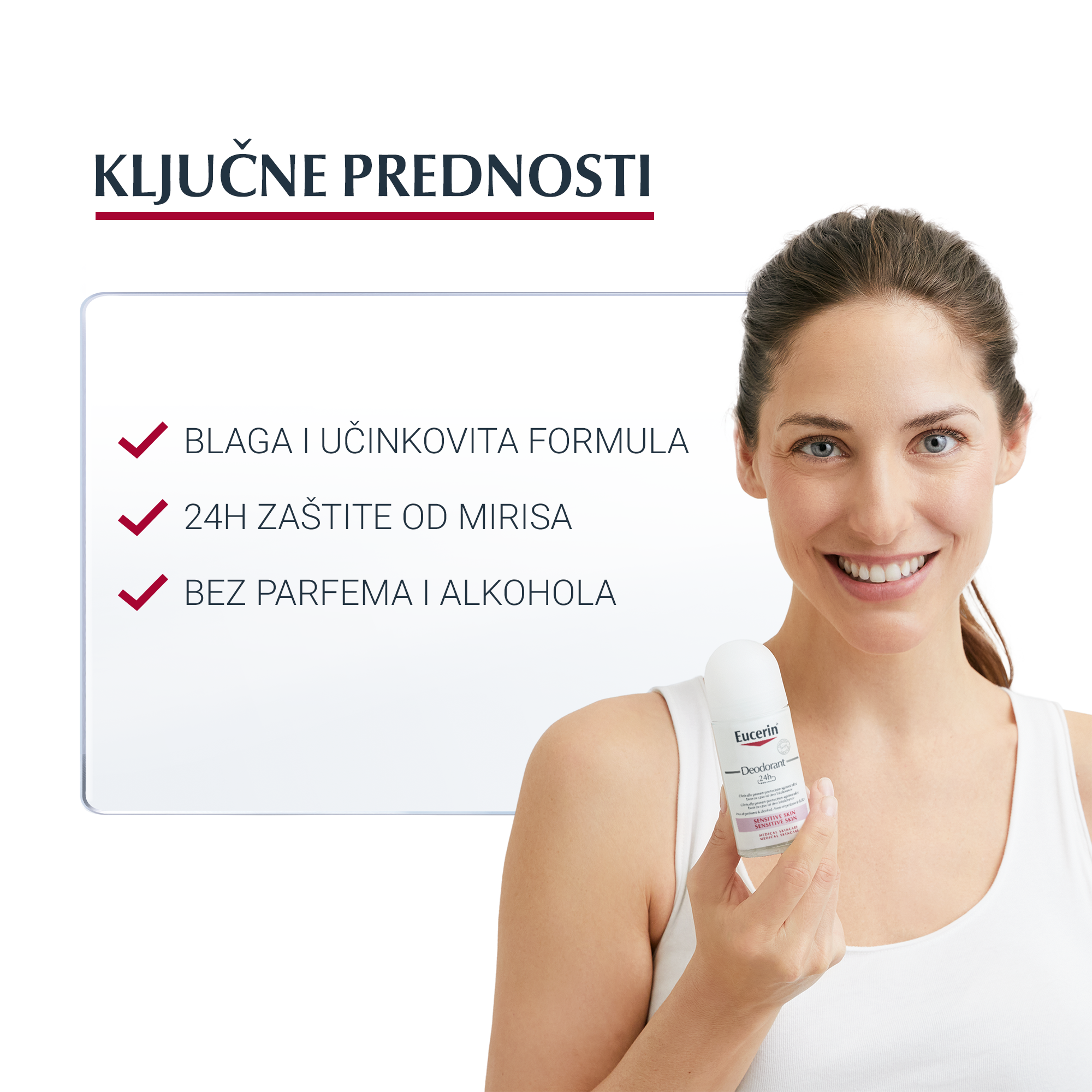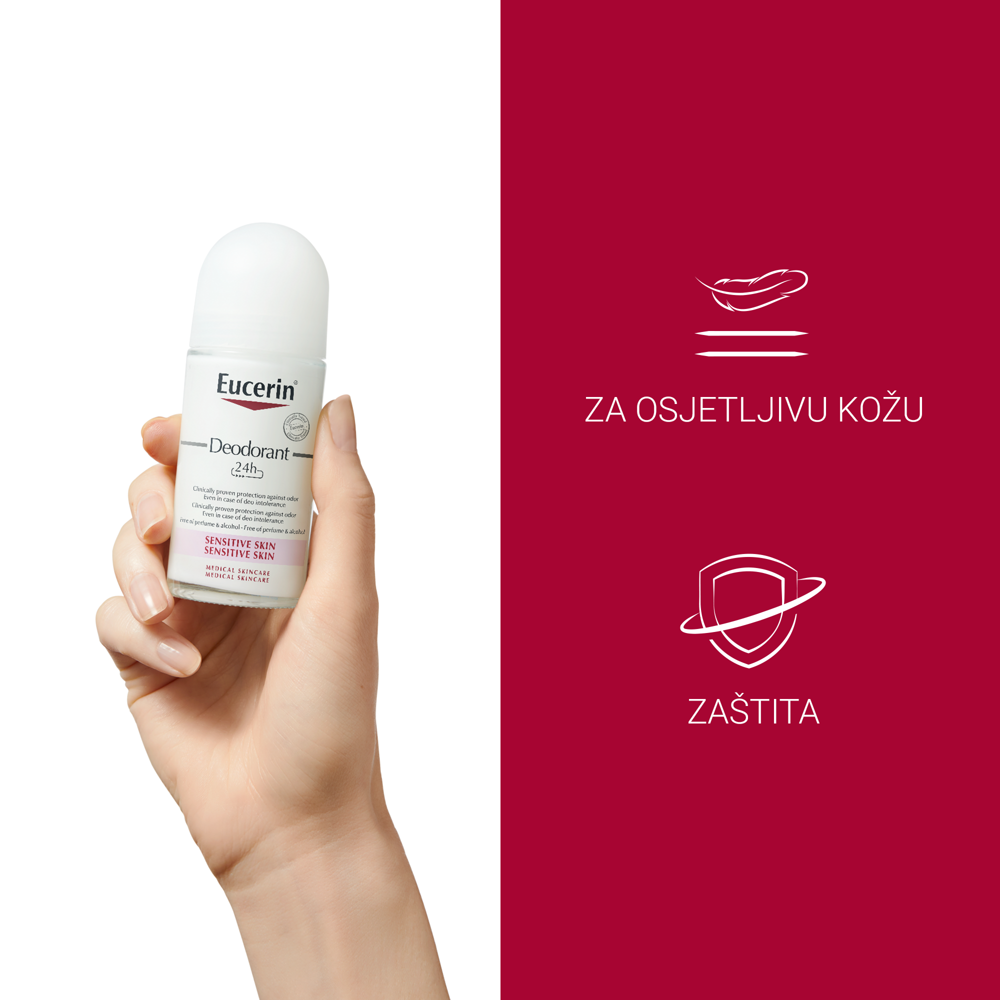 Eucerin Roll-on dezodorans za osjetljivu kožu ne sadrži potencijalne iritanse poput mirisa, alkohola, konzervansa i boje. Koži vraća prirodnu pH vrijednost. Formula je ispitana i dokazano učinkovita kod osoba s vrlo osjetljivom kožom i atopijskim dermatitisom te kod osoba sklonih alergijama na dezodorans i ekcemima u području pazuha