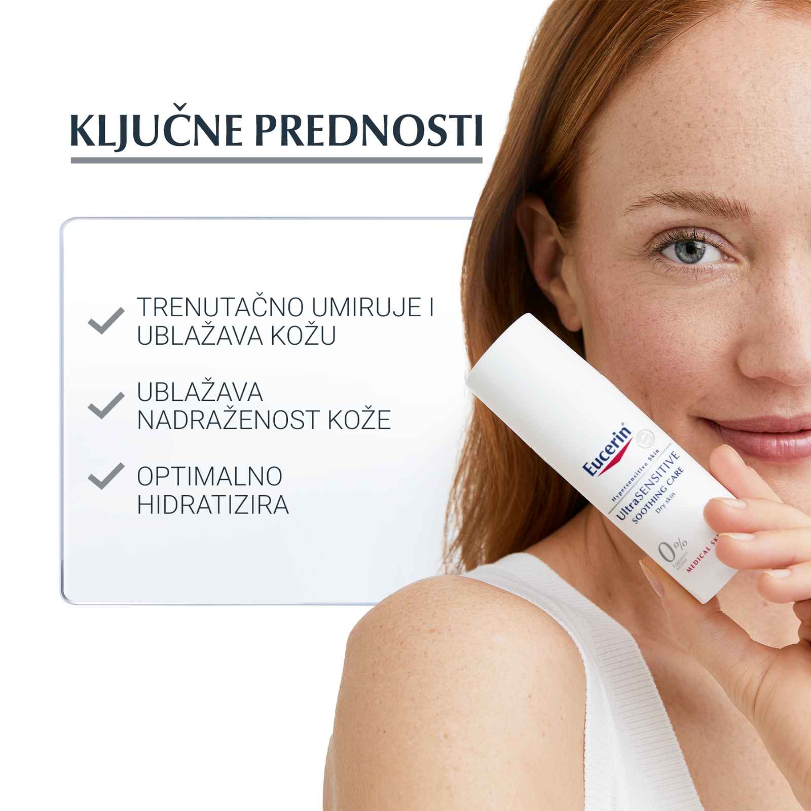 UltraSENSITIVE krema za suhu kožu ne samo da trenutačno umiruje izrazito osjetljivu suhu kožu već tijekom vremena pomaže i u zaštiti barijere kože i povećava granicu tolerancije kože. Kao i svi preparati iz Eucerin linije za njegu izrazito osjetljive kože, i UltraSENSITIVE krema za suhu kožu ima ambalažu koja sprječava zagađenje. Također sadrži samo ograničen broj sastojaka za veću čistoću i manji rizik od reakcije.