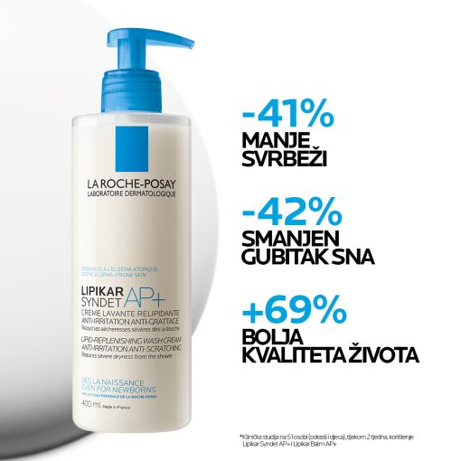 * Kliničko ispitivanje provedeno na 51 ispitaniku (odrasli i djeca) tijekom 2 tjedna upotrebe proizvoda Lipikar syndet AP+ i Lipikar Balm AP+M.
