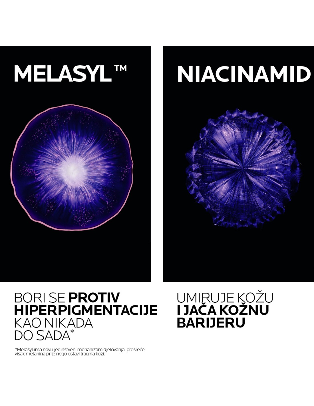 Zahvaljujući patentiranom sastojku Melasyl™, formula ciljano djeluje na tamne mrlje nastale zbog sunca, dobi ili tragova nakon akni. PHA kiseline pružaju blag eksfolijacijski učinak, potiču obnovu površinskih stanica kože i doprinose svježijem, blistavijem izgledu tena, dok niacinamid pomaže umiriti kožu i ojačati njezinu zaštitnu barijeru.