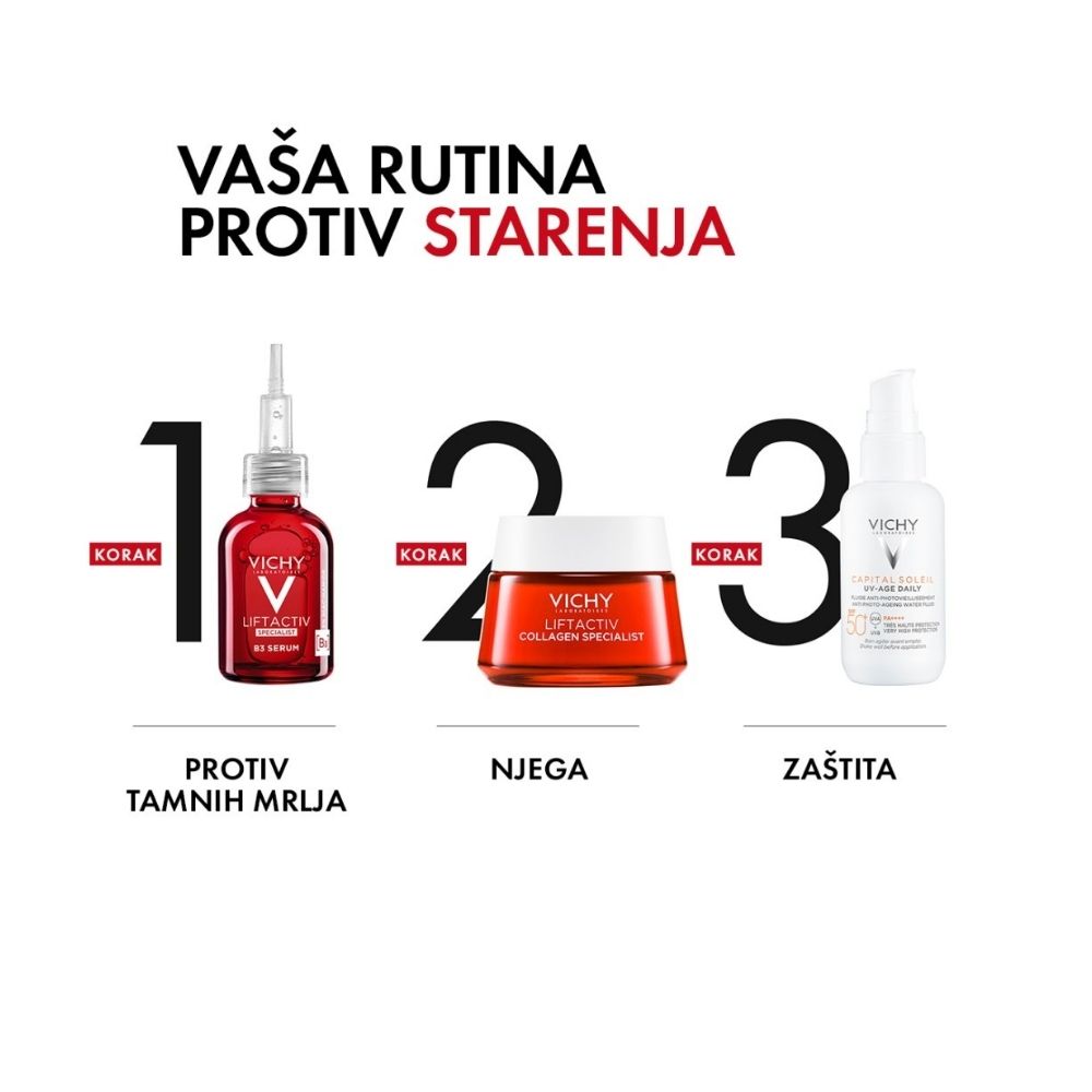 Napredna dermokozmetička zaštita koja pruža vrlo visoku zaštitu od UVA i UVB zračenja te vidljive svjetlosti, uz istovremeno djelovanje protiv znakova fotostarenja. Formula s 4% peptida potiče obnovu kože i doprinosi vidljivo punijem izgledu, dok 2% niacinamida pomaže u smanjenju tamnih mrlja i ujednačavanju tena. Hipoalergena i nekomedogena tekstura pogodna je za svakodnevnu primjenu, bez osjećaja težine na koži. Formulirano kako bi se smanjio rizik od peckanja očiju te ispitano pod oftalmološkim nadzorom.
